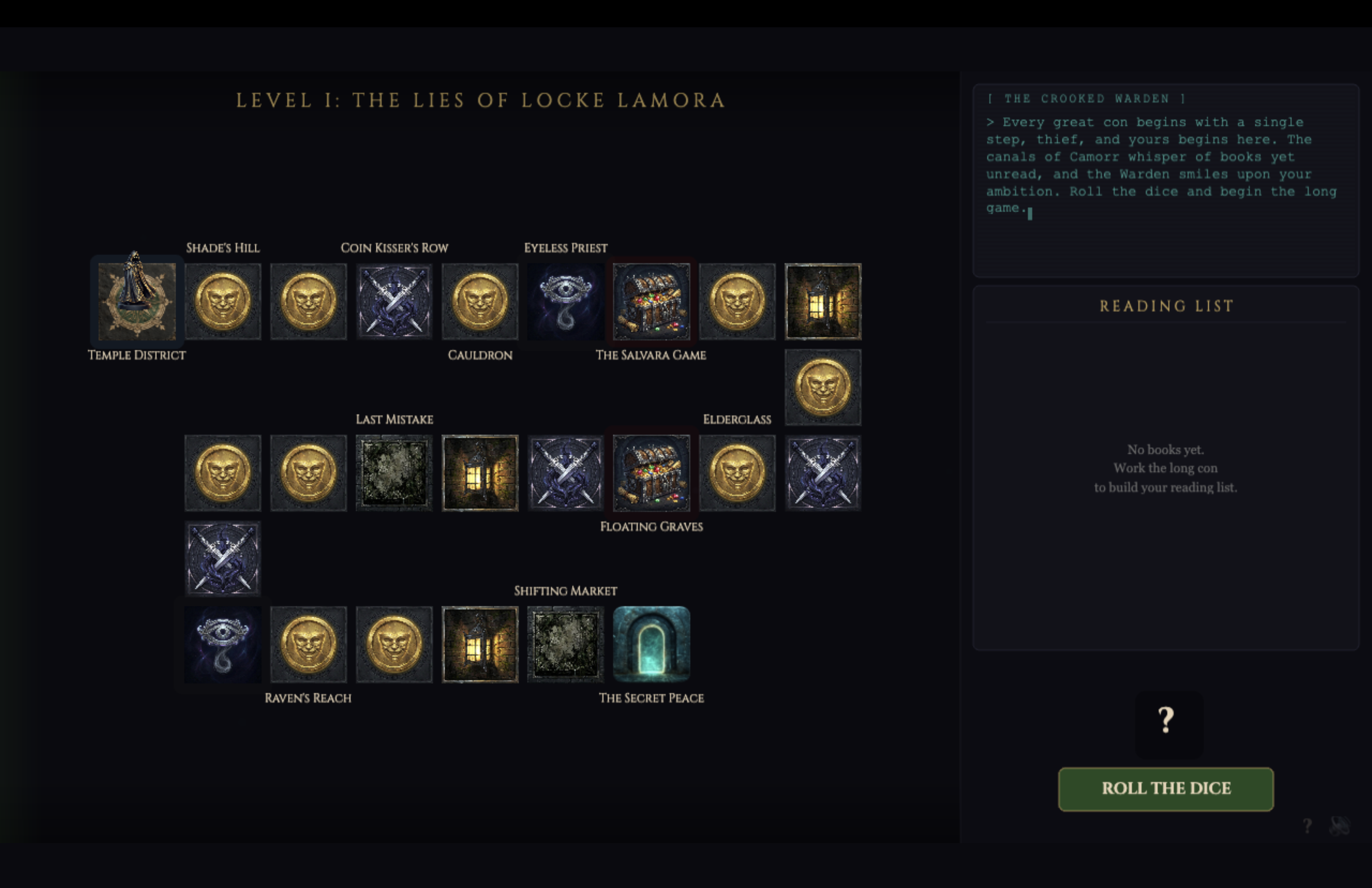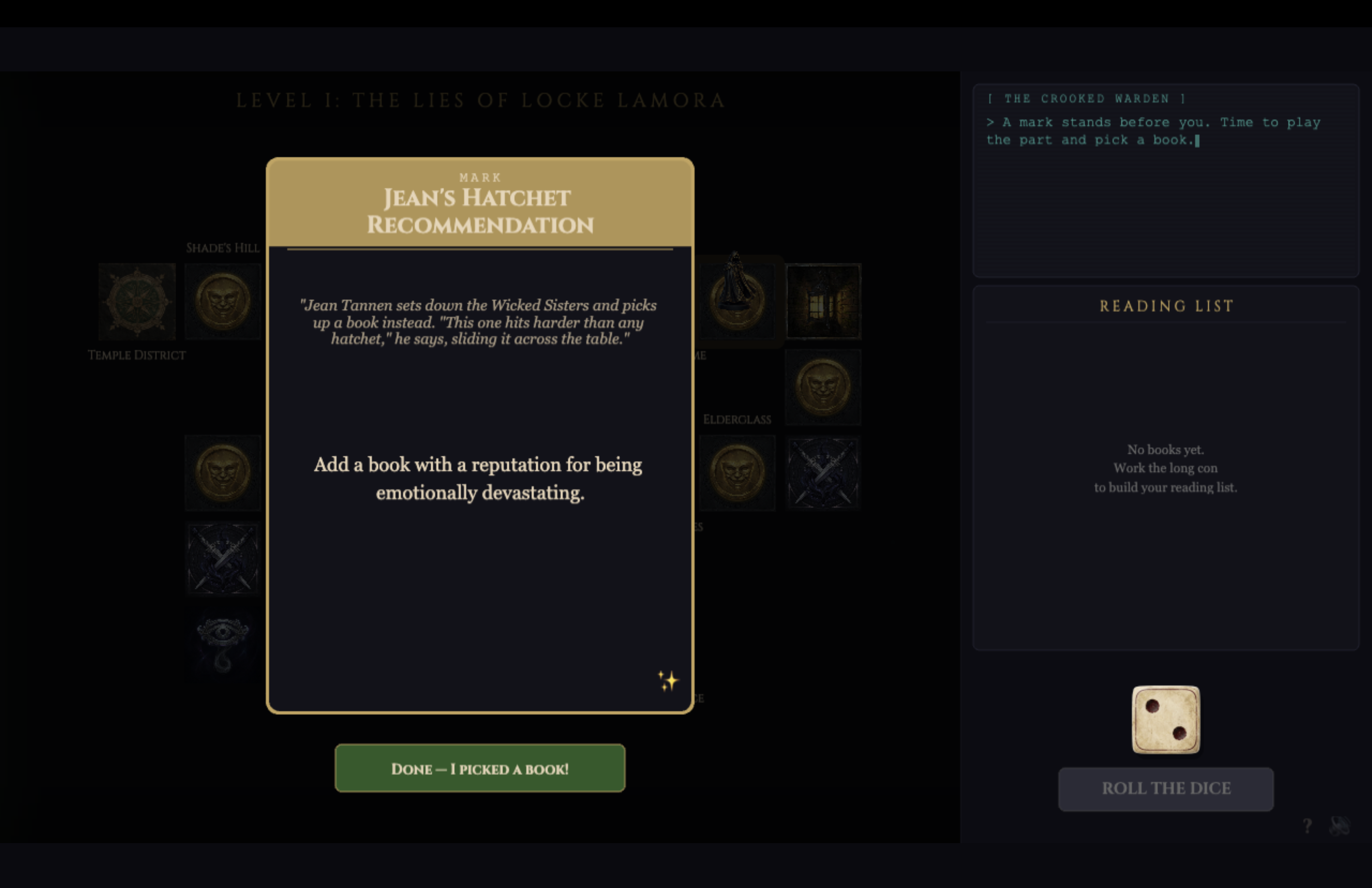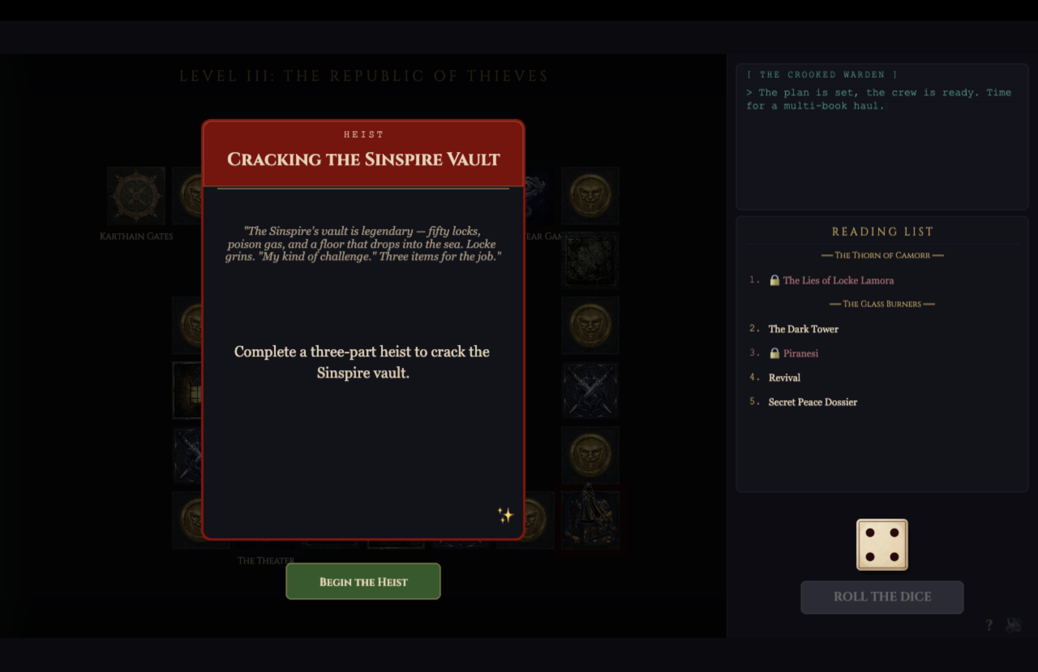 You are a thief. A liar. A gentleman. And tonight, the Crooked Warden has a job for you — pull off the greatest literary heist across three cities, and walk away with a reading list worth dying for. Roll the dice, play the long con, and pray the Yellowjackets don’t catch you with too many books in your pockets.