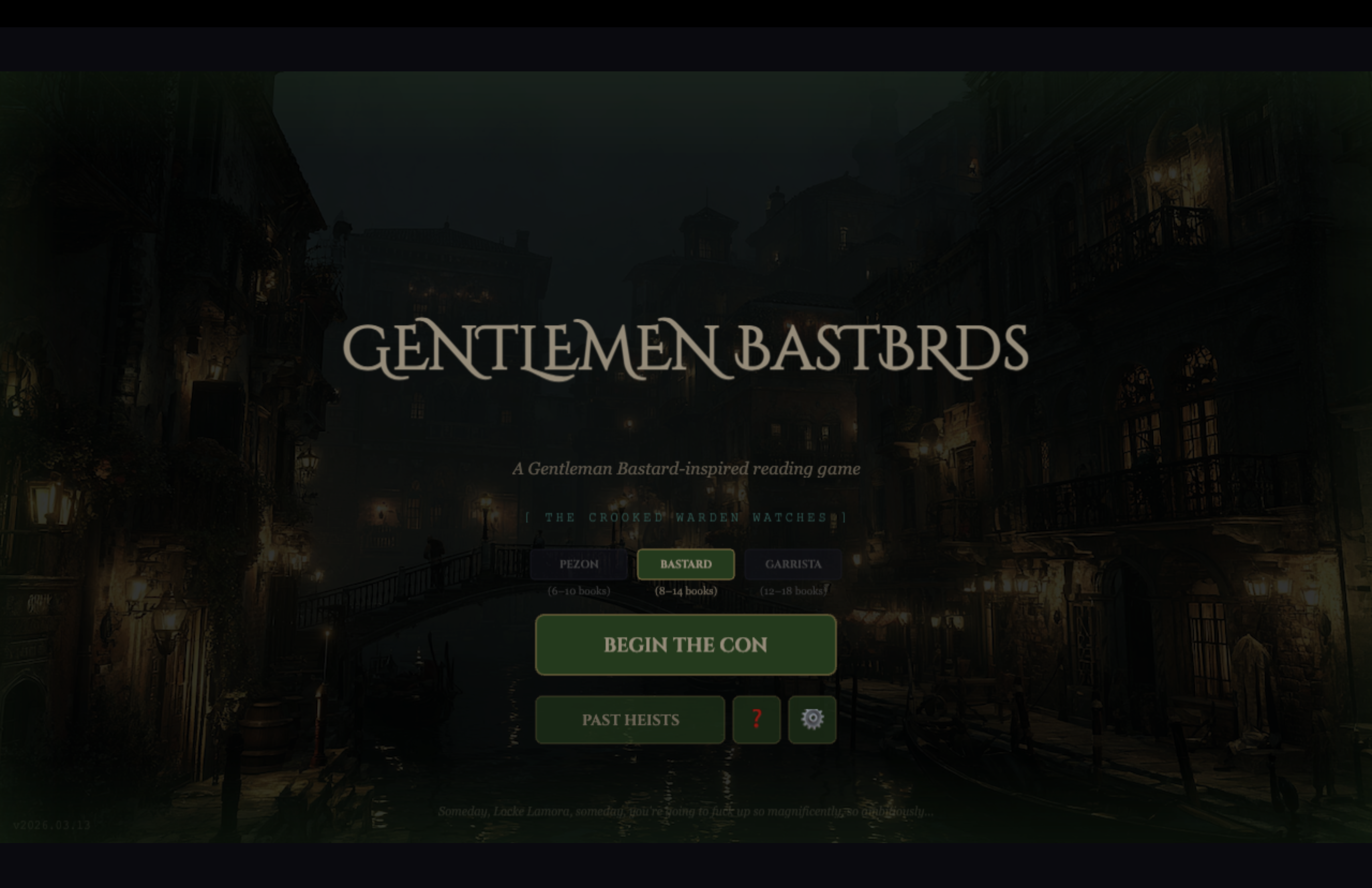 Inspired by Scott Lynch’s Gentleman Bastard series, Gentlemen BasTBRds sends you on a dice-rolling heist through three legendary cities — Camorr, Tal Verrar, and Karthain. Each city is a 25-space board filled with encounters that add, swap, steal, and lock books onto your reading list. The Crooked Warden narrates your journey in riddles and double meanings, and every card drips with the flavor of thieves’ cant and elderglass towers.