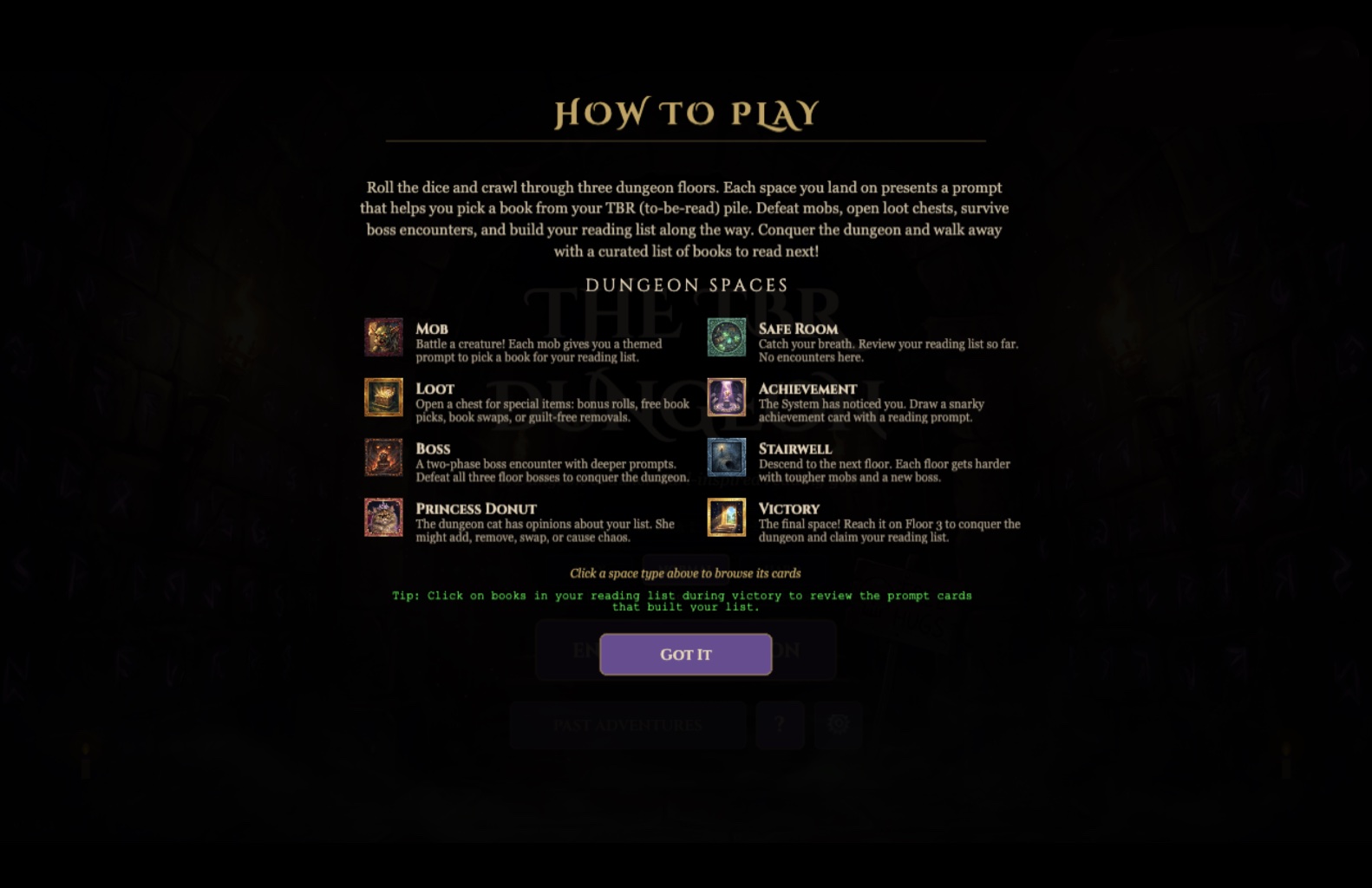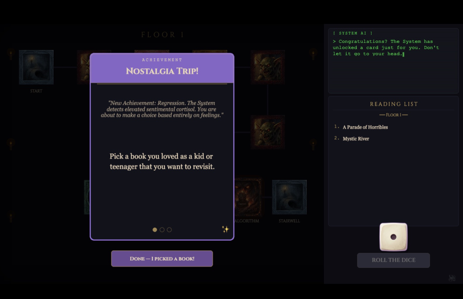 You wake up wearing nothing but white boxer shorts covered in little red hearts. A snarky AI voice informs you that you’ve been selected to descend into the dungeon. Your weapon? Books. Your enemy? Your own indecision. Welcome to The TBR Dungeon.