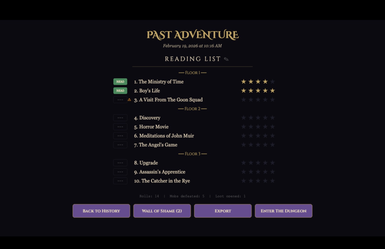 - Game history & book list export — track your runs and export your curated reading lists