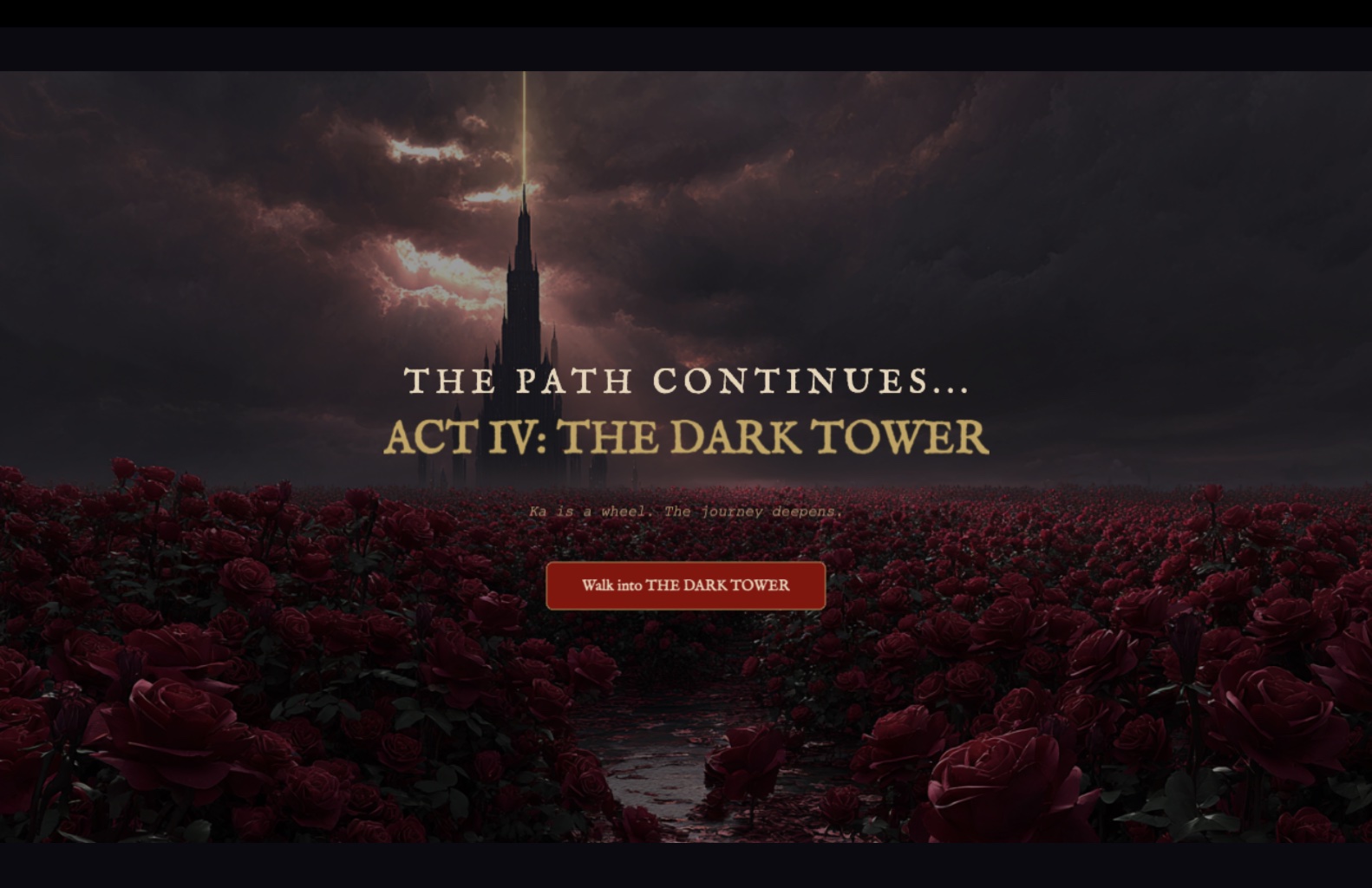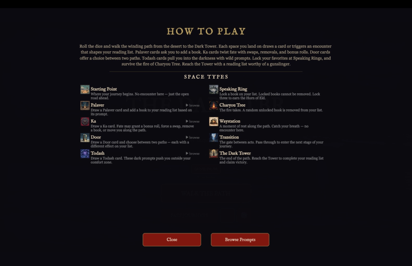 Inspired by Stephen King’s Dark Tower, The Dark TBR sends you across four Acts of a mythic journey spanning roughly 80 spaces. This is not a dungeon. This is a pilgrimage. Each space is a trial — a palaver, a door between worlds, a visit to the Todash darkness — and every trial adds weight to the reading list you carry.