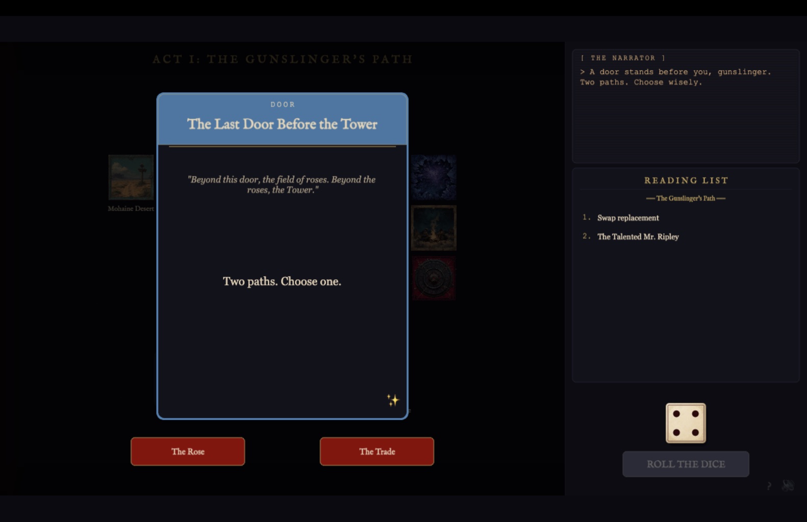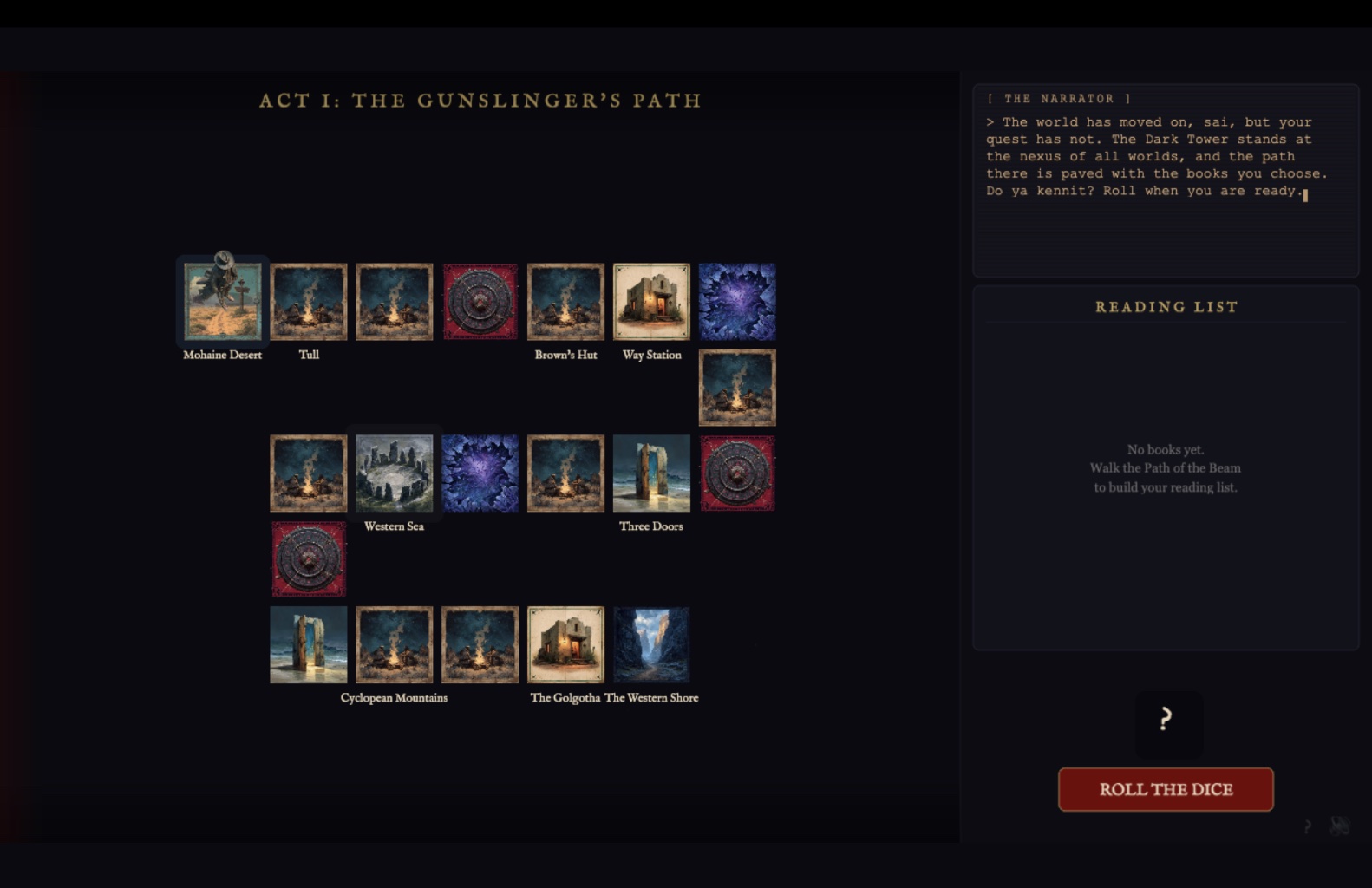 There are other worlds than these. You walk as a gunslinger along the Path of the Beam, and every trial you face shapes the reading list you carry to the Tower. The Roland Deschain AI Oracle walks beside you — weathered, watchful, offering counsel in the cadence of a world that has moved on.