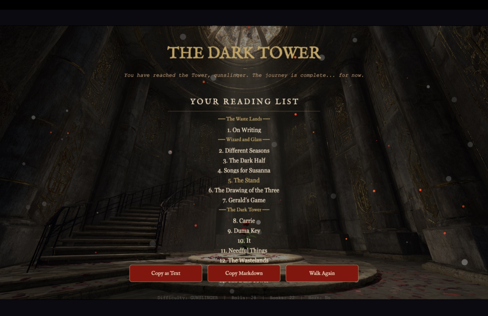 - 3 difficulty levels — Ka-Tet (6–10 books), Gunslinger (8–14 books), Tower (12–18 books)